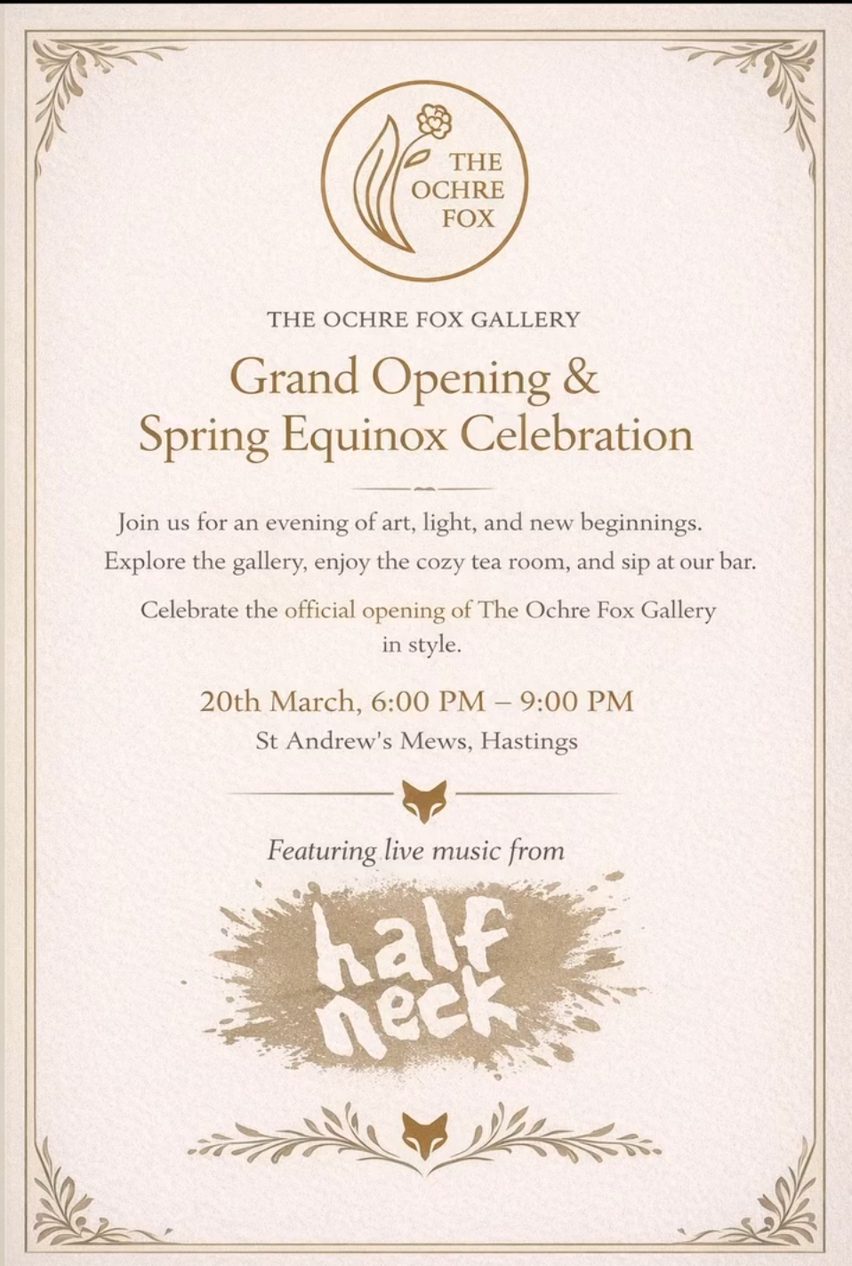New Gallery opening in Hastings Town Centre: The Ochre Fox, Showcasing local & original art. Opening event Friday 20 March 2026. I have a painting, plus prints, mugs and books. St Andrews Mews, 1 Waldegrave Street, Hastings TN34 1SP.